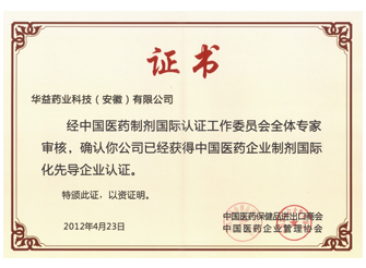 獲得中國醫(yī)保商會頒布的中國醫(yī)藥企業(yè)制劑國際化先導(dǎo)企業(yè)認證證書